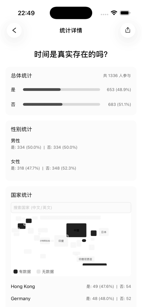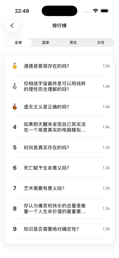 在这里,你可以思考经典哲学问题,查看不同观点的统计结果,